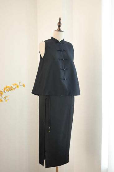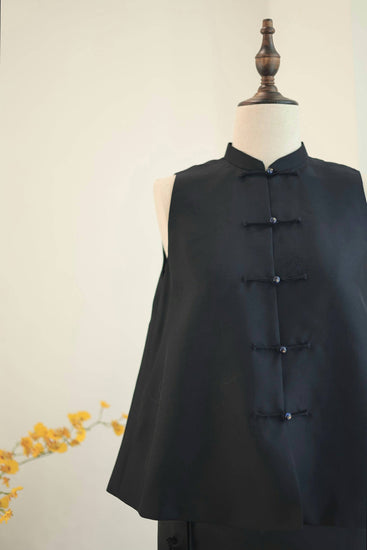 Ink-Hued Silk A-Line Mandarin Vest (Exclusive Piece) 深墨色真絲立領A擺馬甲(孤品)