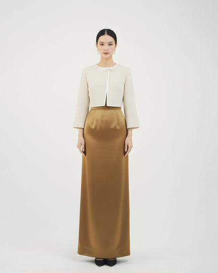 一款香檳色單鈕扣外套,配以披肩領與翻袖設計,完美融合優雅氣質與現代風格。