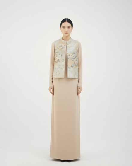 此款菊花貝母緙絲法式刺繡背心,將繁複的花卉紋樣與精緻的貝母飾片巧妙融合,完美展現中國傳統工藝與法式刺繡技藝的交融之美。此奢華單品能為任何裝束增添優雅氣韻。