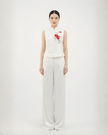 Crafted with traditional kesi (緙絲) weaving, this vest features an ivory-toned textured base and detailed floral embroidery in crimson and blush tones. The stand collar and diagonal front panel, secured with pearl-style knotted buttons, lend an elegant structure to the silhouette. An asymmetrical overlay adds a modern dimension, making it a refined yet expressive layering piece—perfect for pairing with silk blouses or dresses for a graceful everyday ensemble.