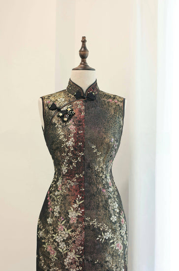 The Ember Bloom Nishijin Brocade Qipao (Exclusive Piece) is crafted from exceptionally rare black-red Nishijin brocade, where golden threads weave a tapestry of twilight florals and trailing vines, reminiscent of embers flickering in the night. The hand-sculpted floral knotted buttons add a delicate, artisanal touch, blending tradition with intricate craftsmanship. Its asymmetrical closure and tailored silhouette accentuate the body's natural curves, balancing strength and elegance. A one-of-a-kind creation, this qipao embodies the pinnacle of oriental sophistication and timeless artistry.