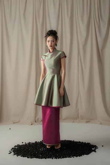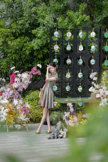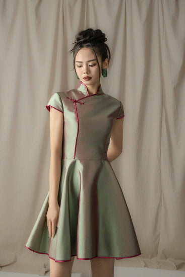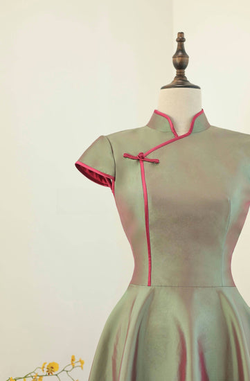 This qipao dress blends tradition with modernity, featuring luminous fabric that shifts between emerald and smoky pink hues. The delicate knotted closure and tailored fit enhance its elegance, while the A-line skirt adds movement. Wear it alone for a graceful look or pair it with a long skirt for a refined, layered style. Perfect for both casual and formal settings, it effortlessly adapts, capturing light and elegance in every step.