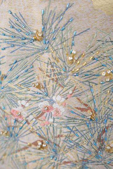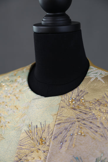 This exclusive piece is inspired by the interplay of pine shadows and drifting clouds, weaving a tranquil poetic realm. The fabric features layered pine needles interwoven with delicate plum blossoms, accentuated by gold threads and bead embroidery, evoking the glistening morning dew on pine branches. The asymmetric paneling design introduces a sculptural depth, seamlessly blending the elegance of traditional Japanese craftsmanship with contemporary tailoring, creating a harmonious dialogue between heritage and modernity.