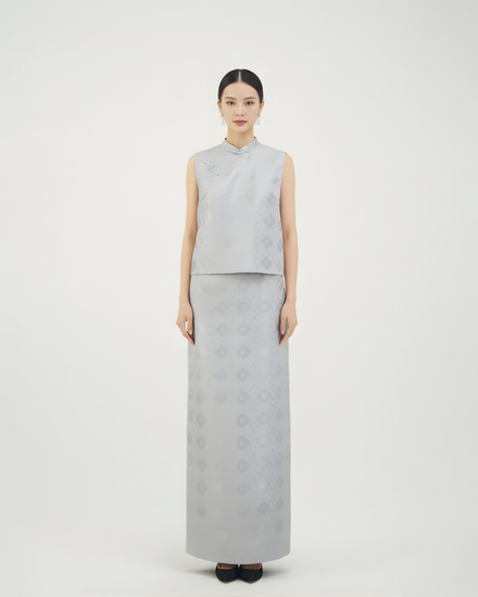 This Song Brocade ensemble features a subtle silver-grey base interwoven with pale blue and mist-gold geometric motifs, radiating an understated yet refined lustre. The sleeveless top with a mandarin collar and delicate knot button detailing pairs with a matching high-waisted skirt, creating a soft and elongated silhouette. The intricate texture of Song brocade shimmers gently under the light, capturing the harmony of grace and strength in the modern woman.