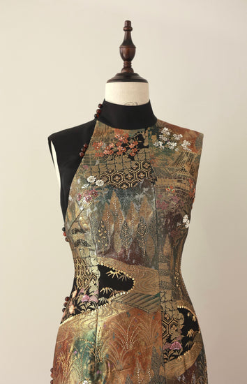 This Gilded Night Nishijin Brocade Qipao is crafted from rare Japanese Nishijin brocade, where gold and silver threads weave through a deep-toned backdrop, exuding a rich, luminous elegance. The fabric depicts pavilions, florals, and seasonal landscapes, unfolding like a timeless oriental painting. The asymmetrical knotted closure enhances its traditional allure, while the tailored fit elegantly follows the body's curves. The interplay of gold and black embodies both refinement and mystery, making this a one-of-a-kind masterpiece, a vision of opulence beneath the night sky.