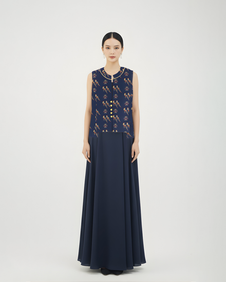 這款金羽錦緞背心採用典雅深藍色面料,綴以精緻的金色雉雞圖案,象徵高貴與優雅。金邊滾條與鈕扣增添精緻細節,結構化剪裁融合傳統與現代精緻感。作為百搭的亮眼單品,無論正式場合或時尚日常穿搭皆完美適宜。