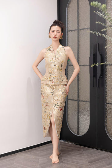 The Golden Meadow Nishijin Brocade Vest Set (Exclusive Piece) is crafted from rare Japanese Nishijin brocade, where gold and silver threads weave a poetic autumn landscape of florals and grasses. The halter-neck vest elegantly frames the neckline, while the structured peplum design enhances the waistline. Paired with a front-slit midi skirt, this ensemble creates a sleek, elongated silhouette. A one-of-a-kind creation that cannot be reproduced, its timeless golden hues and intricate patterns embody a fusion of vintage opulence and contemporary elegance.