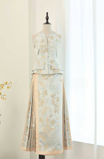 Crafted from lustrous golden silk, this skirt features intricate floral jacquard patterns that exude classical elegance. The traditional Mamian silhouette, combined with a soft drape, creates a look that is both regal and graceful, blending heritage charm with modern sophistication.