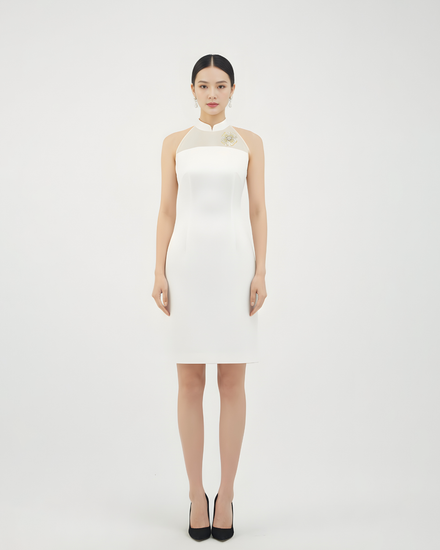 The Golden Silk Embroidery Sheer White Short Qipao combines delicate silk organza and high-density silk, creating a luminous, refined texture. The hand-embroidered floral appliqué with gold-thread detailing and subtle beadwork adds a touch of understated luxury. Featuring a high mandarin collar and sleeveless cut, this qipao elongates the neckline, while its sleek silhouette offers an effortlessly graceful and ethereal aesthetic.