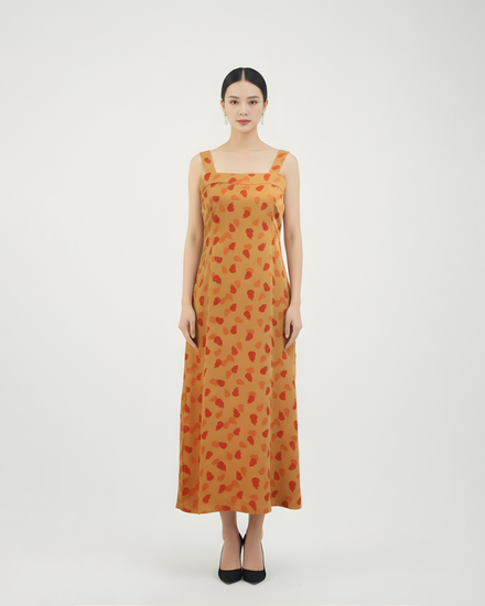 輕巧可愛的香雲紗連衣裙,以溫暖橘黃為底,點綴葫蘆圖樣,俏皮又不失東方雅韻。寬肩帶設計搭配修身剪裁,展現自在又柔美的身形曲線,是夏日出遊或日常穿搭的亮眼之選。