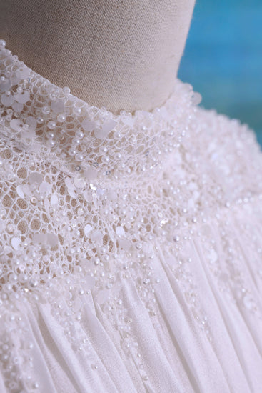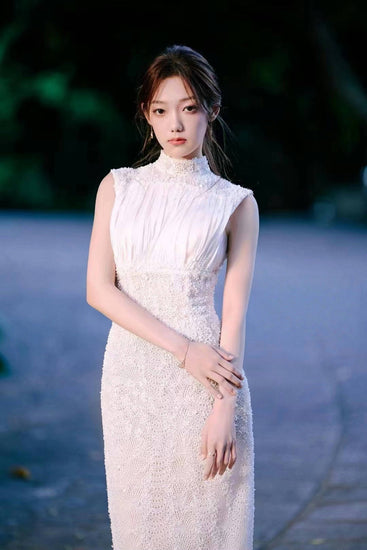 This white lace gown exudes elegance and sophistication. The high neckline and delicate pleats add a vintage touch, while intricate beadwork or embroidery enhances its refined charm. The slim-fit silhouette flatters the figure, making it perfect for formal events or weddings.