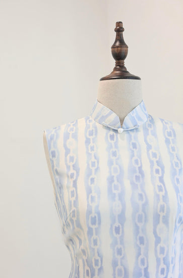 The Ice Lock Silk Qipao is crafted from lightweight silk, offering a smooth, delicate touch with a soft icy-blue sheen. The chain-like flowing pattern creates a rhythmic, understated elegance with a modern twist. Featuring a high mandarin collar and tailored fit, this piece enhances the natural silhouette, blending classic oriental charm with a sleek, contemporary aesthetic.