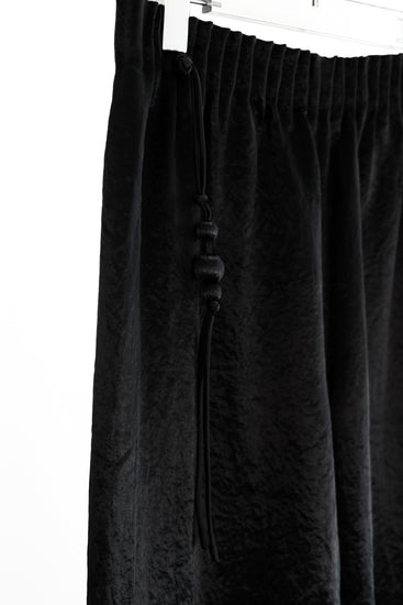 這款闊腿褲採用具有絲感的銅氨絲面料,垂墜柔順,輕盈透氣,適合日常穿著。整體黑色低調內斂,面料帶有微光與細膩紋理,褲腰處的盤扣繩結細節增添東方韻味,鬆緊設計兼顧舒適與實用性。