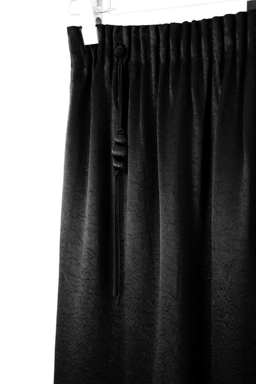 Crafted from breathable and fluid acetate fiber (Cupro), these flowing black trousers are a minimalist yet elegant piece for everyday wear. The subtle sheen and textured surface add depth to the classic black palette, while the knotted drawstring with oriental bead accents offers a touch of traditional detail. Elasticated waist for comfort and flexibility.