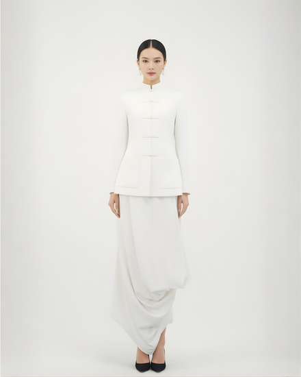 A modern two-piece set made from pure silk, featuring a tailored Mandarin-style jacket with fabric knots and a fluid draped midi skirt. Elegant, structured, and perfect for formal or ceremonial occasions.