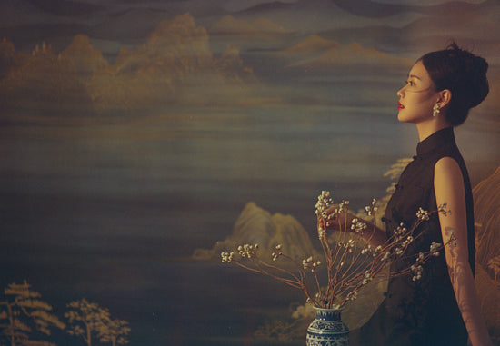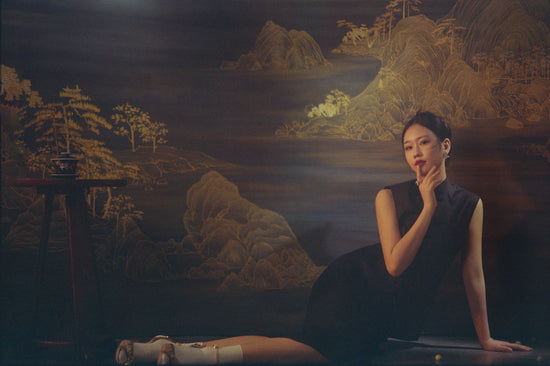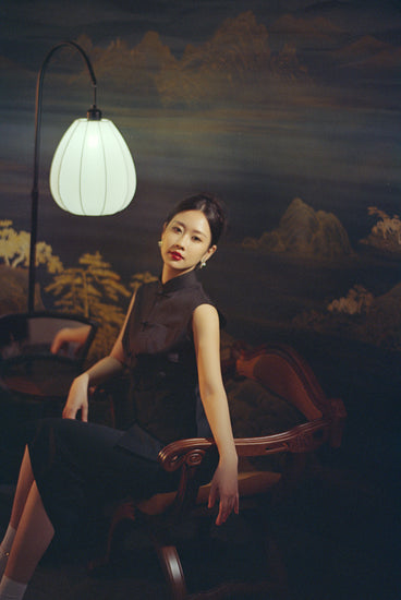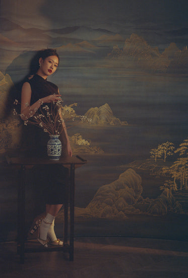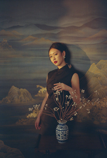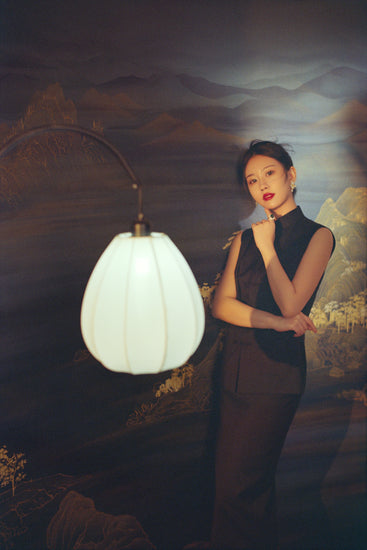 This one-of-a-kind qipao set, crafted from Loro Piana's premium suiting fabric, merges traditional Chinese elements with Italian tailoring, presenting a silhouette of graceful strength and refined structure.