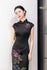 Featuring a mandarin collar with black knotted buttons, this qipao enhances an air of understated sophistication. The tailored silhouette and side slit allow graceful movement, balancing tradition and modern elegance. The rich black backdrop highlights the delicate floral artistry, creating a timeless statement of quiet luxury.