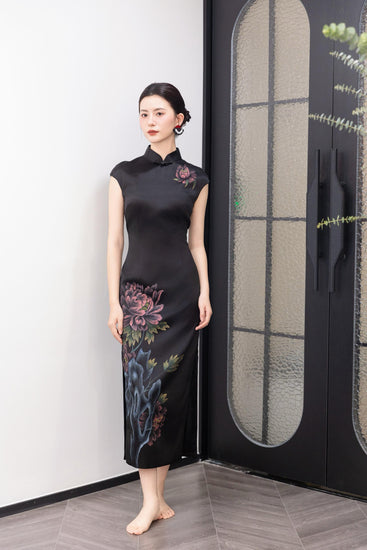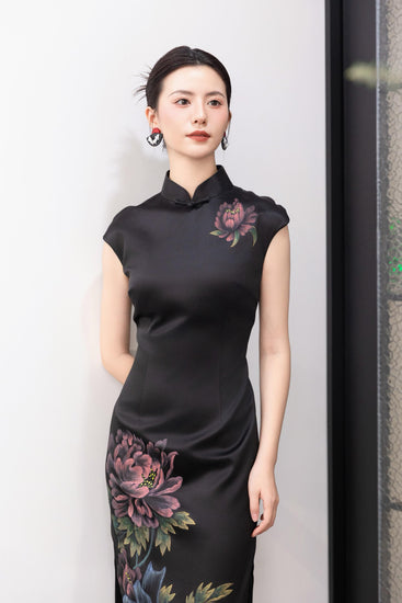 Midnight Peony Hand-Painted Black Silk Qipao 午夜牡丹·黑色真絲手繪旗袍