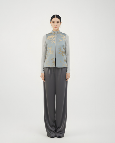 採用漳絨製成的無袖立領背心,以煙藍色為底,綴以金色的梅竹紋樣。纖細金線勾勒出優美枝椏——竹影流露雅致風韻,梅花象徵堅韌精神。古典韻致與現代剪裁相融,無論搭配傳統或當代風格皆游刃有餘。
