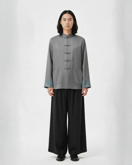This men's Mandarin-style jacket is crafted from natural tussah silk in an elegant smoky grey tone with a soft sheen. Featuring traditional knotted buttons and a relaxed fit, it blends Oriental heritage with modern minimalism. Large pockets add practicality, making it perfect for both casual and refined wear.