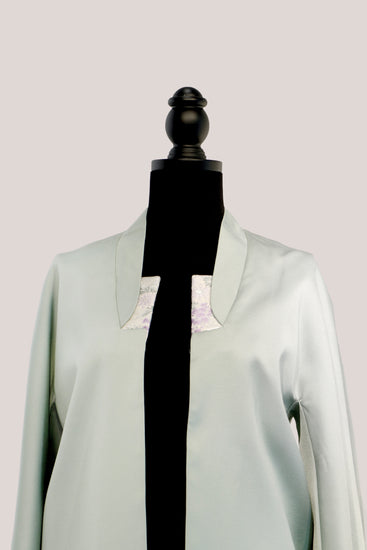 With a muted moss green hue and subtle brocade accents, this jacket evokes calm sophistication. The relaxed cut and open front make it an elegant yet versatile wardrobe piece.