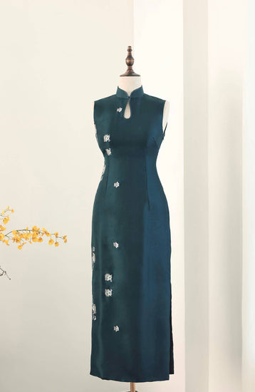 This stunning qipao in a vibrant peacock blue hue features simple hand-embroidery on sheer fabric, exuding elegance and grace. The delicate teardrop collar adds a unique touch of sophistication, making it a perfect blend of traditional charm and modern refinement.