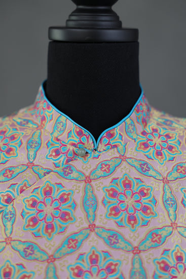 This New Chinese dress is crafted from pink Song brocade, featuring intricate patterns with a soft, luminous sheen that embodies Eastern elegance. The hem is adorned with delicate ostrich feathers, adding a touch of playfulness and opulence. With a minimalist mandarin collar and a modern silhouette, this piece strikes a perfect balance between tradition and contemporary style, making it an ideal choice for elegant daily wear or special occasions.