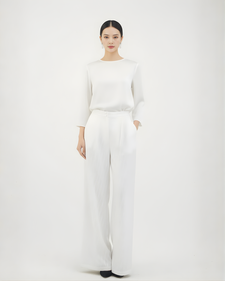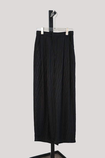 Crafted from jacquard silk with a three-dimensional ripple texture, this pair of straight-leg pants flows effortlessly with movement. The mid-to-high waist cut flatters the silhouette while offering comfort and structure. Available in two versatile tones, it is ideal for refined everyday wear or as an understated complement to more ornate tops.