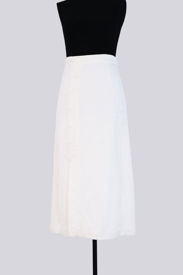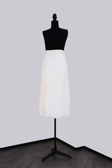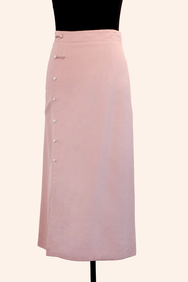 A clean A-line midi skirt in pure silk, featuring a row of decorative frog buttons along a false front flap. A subtle fusion of traditional detail and modern simplicity.