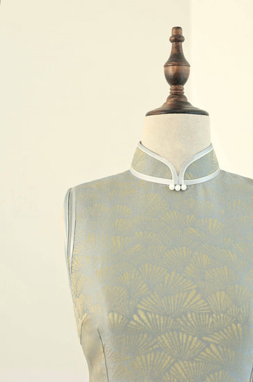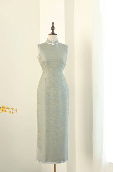 This exquisite qipao features a stunning silver-backed fabric adorned with gold pine jacquard patterns, symbolizing resilience and elegance. The double edging adds a refined touch, enhancing its timeless silhouette. A perfect blend of traditional craftsmanship and modern sophistication, this piece exudes grace and cultural depth.