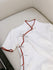 This white silk qipao features striking red piping and delicate frog buttons, blending traditional design with a clean, modern silhouette. Refined and structured, it's perfect for both formal and contemporary occasions.